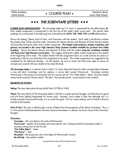 Course Plan The Screwtape Letters Kolbe Academy